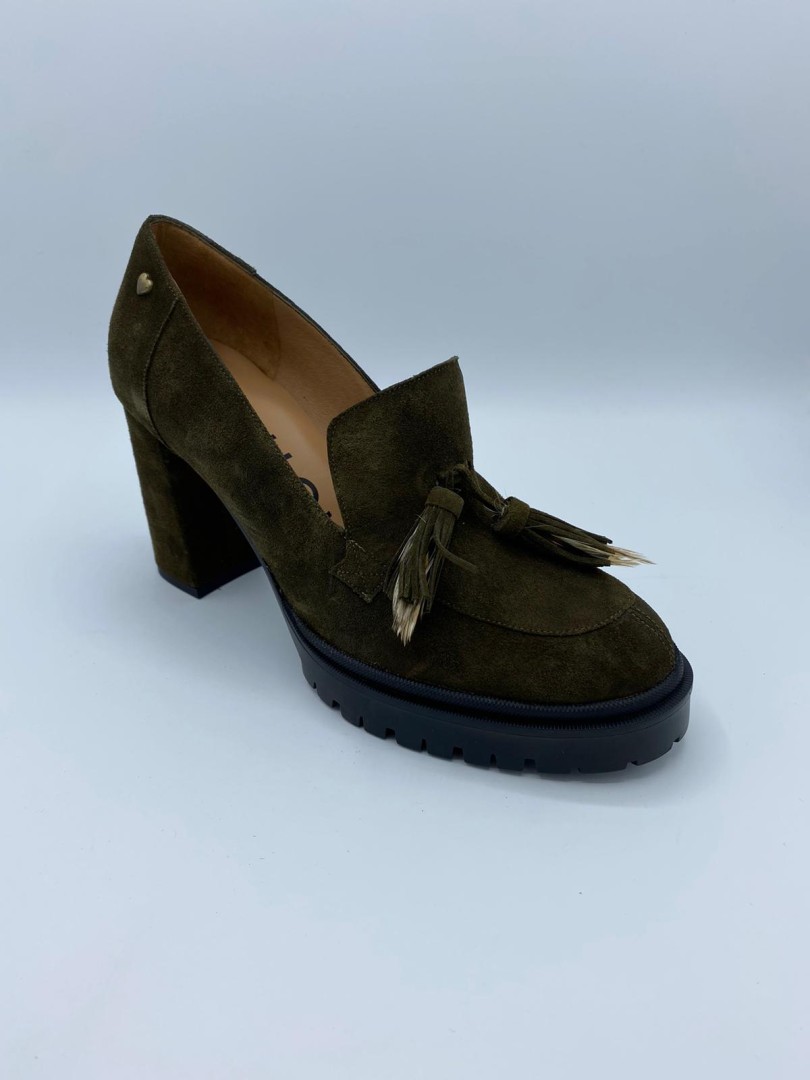 Mocassins pour femmes en cuir suédé vert avec détail plume. Un design réalisé avec un talon haut de 9,5 cm. bout rond Un modèle idéal à combiner avec tous vos looks. Intérieur doublé cuir. Comprend une nouvelle semelle intérieure en gel pour un plus grand confort dans toutes vos étapes. Fabriqué en Espagne.